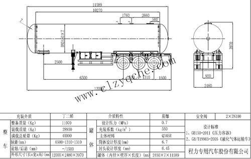 丁二烯半掛車直徑2450毫米,筒體厚度7毫米,封頭厚度8毫米,總長度12米。配用約斯特支腿,雙閥門箱,雙工具箱,雙獨立進液和出液,方便用戶操作。